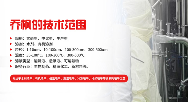 上海喬楓實業(yè)有限公司,成立于2012年,是從事噴霧干燥設備的研發(fā)設計、生產(chǎn)、銷售(小型噴霧干燥機,實驗型噴霧干燥機,35℃低溫噴霧干燥機,有機溶劑噴霧干燥機,低溫閉式循環(huán)噴霧干燥機、超細粉末噴霧干燥機、噴霧冷凍干燥機、真空噴霧干燥機、氣流噴霧干燥機,噴霧造粒干燥機,離心噴霧干燥機,沸騰制粒機等)和售后于一體的綜合性公司,本公司現(xiàn)成為一家致力于為生物制藥、精細化工、新能源、陶瓷造粒及食品工程等領域提供全套解決方案的整線交鑰匙工程企業(yè)。